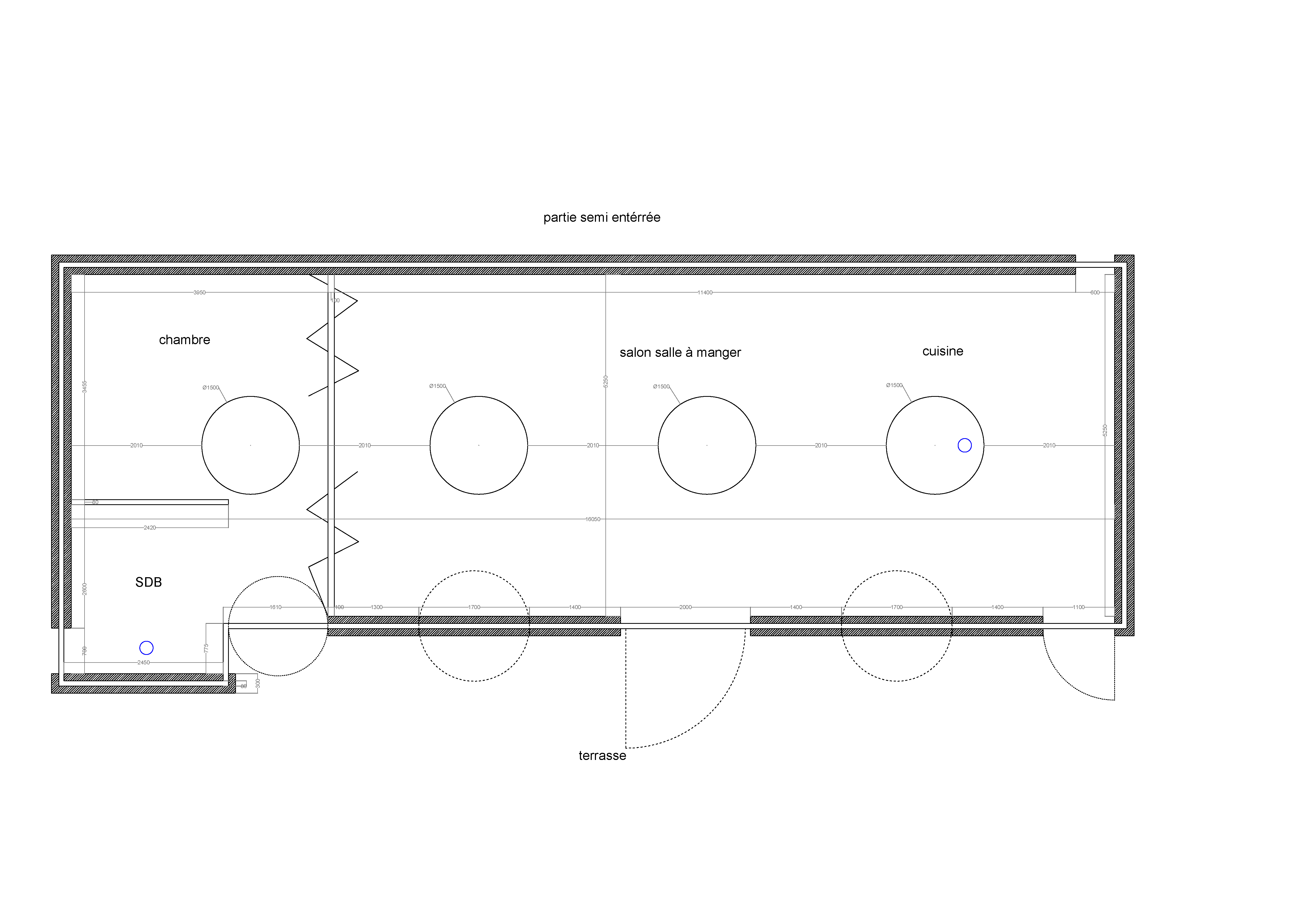 Projection 3D illustrant une réflexion sur la régulation climatique par l’architecture. Le second toit, tel une casquette, vient ombrager le premier, empêchant ainsi le soleil de frapper directement les fenêtres. La maison est semi-enterrée tout en conservant des ouvertures sur l’ensemble de ses façades, ce qui permet à l’air de circuler librement grâce à l’effet Bernoulli lorsque celles-ci sont ouvertes. L’aménagement intérieur, plus libre, s’inspire du post-modernisme.
